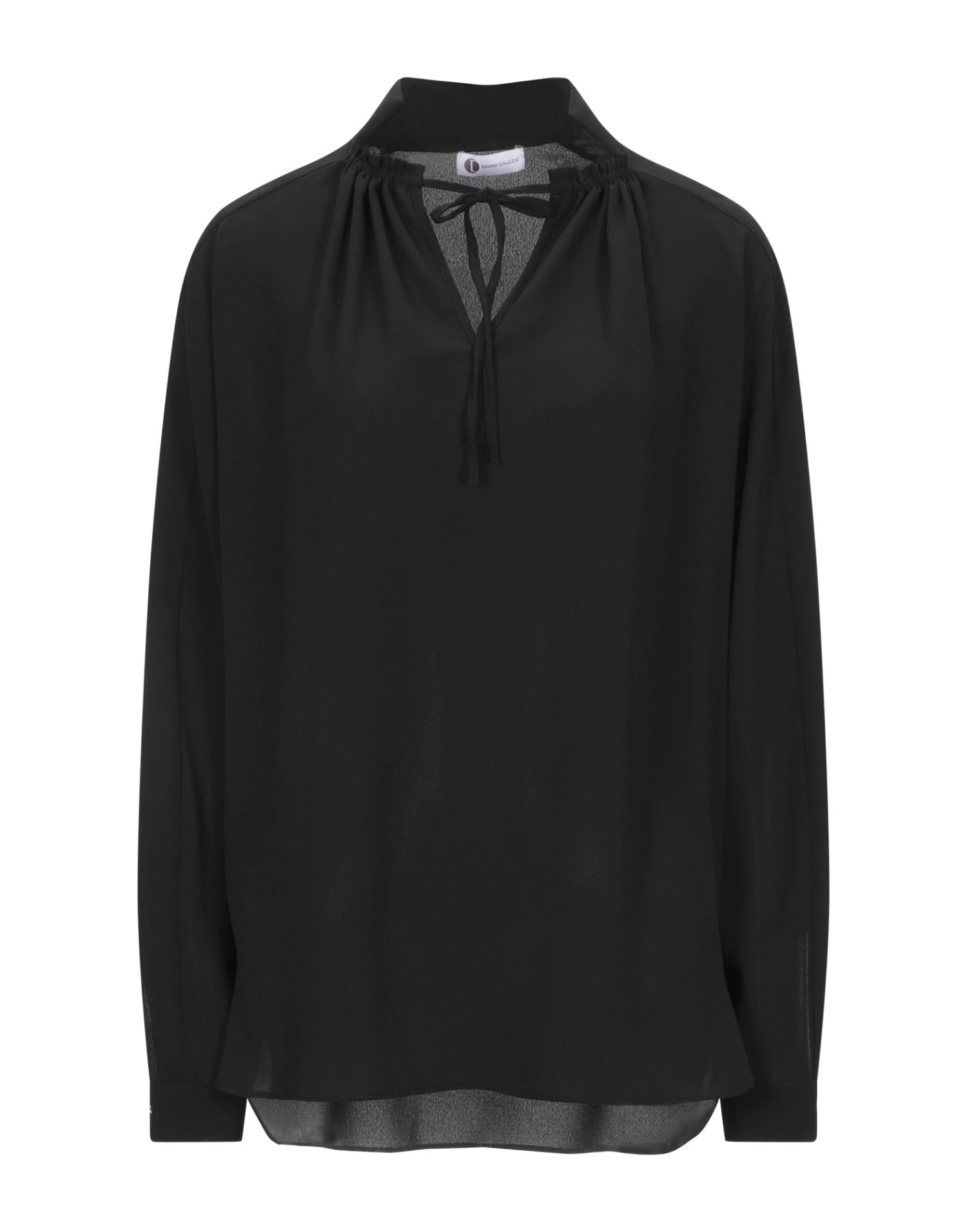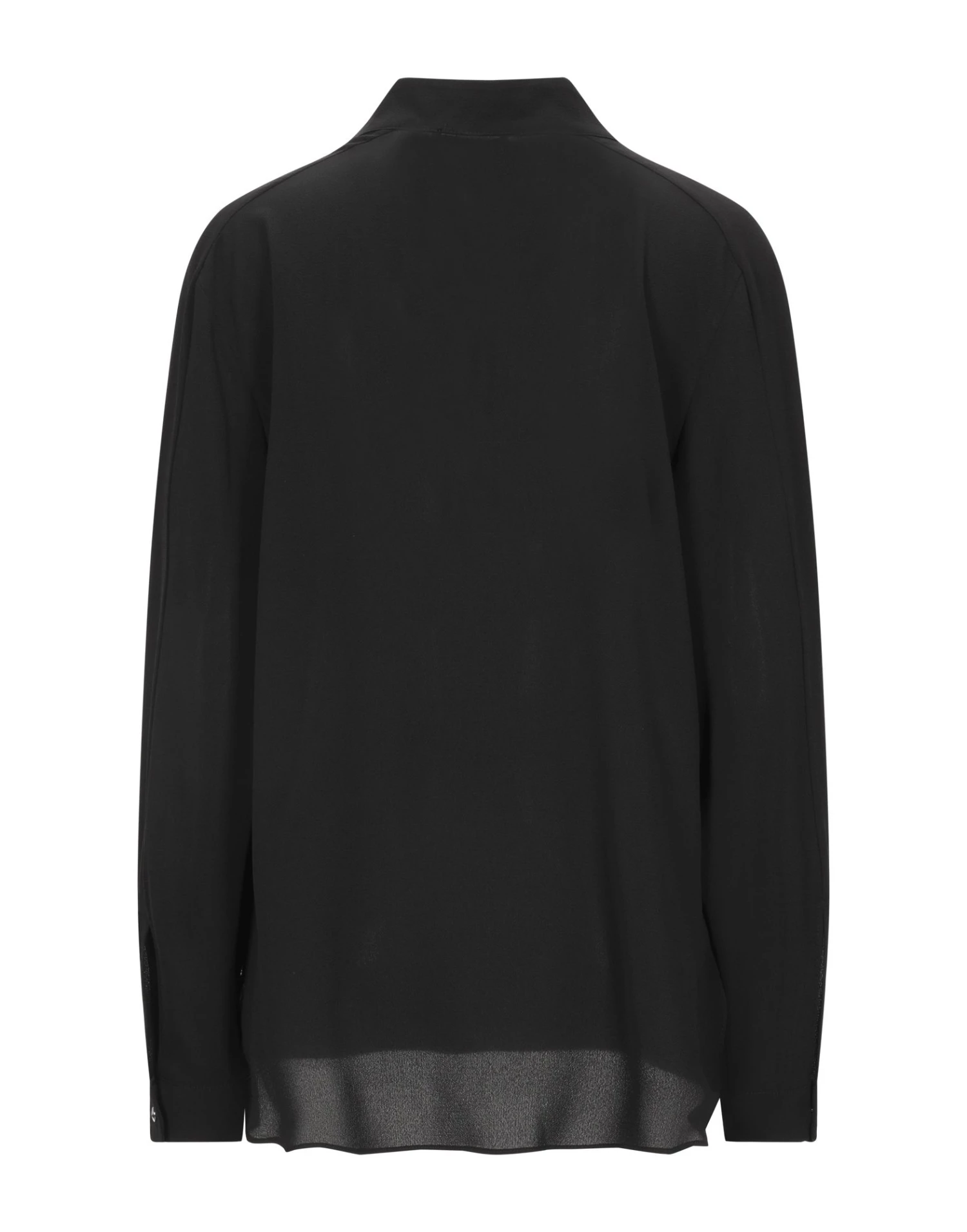 crepe, no appliqués, basic solid color, long sleeves, buttoned cuffs, bow collar, no pockets, side slit hemline, stretch