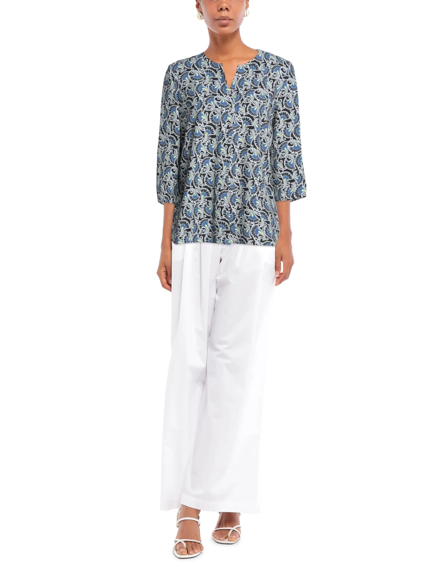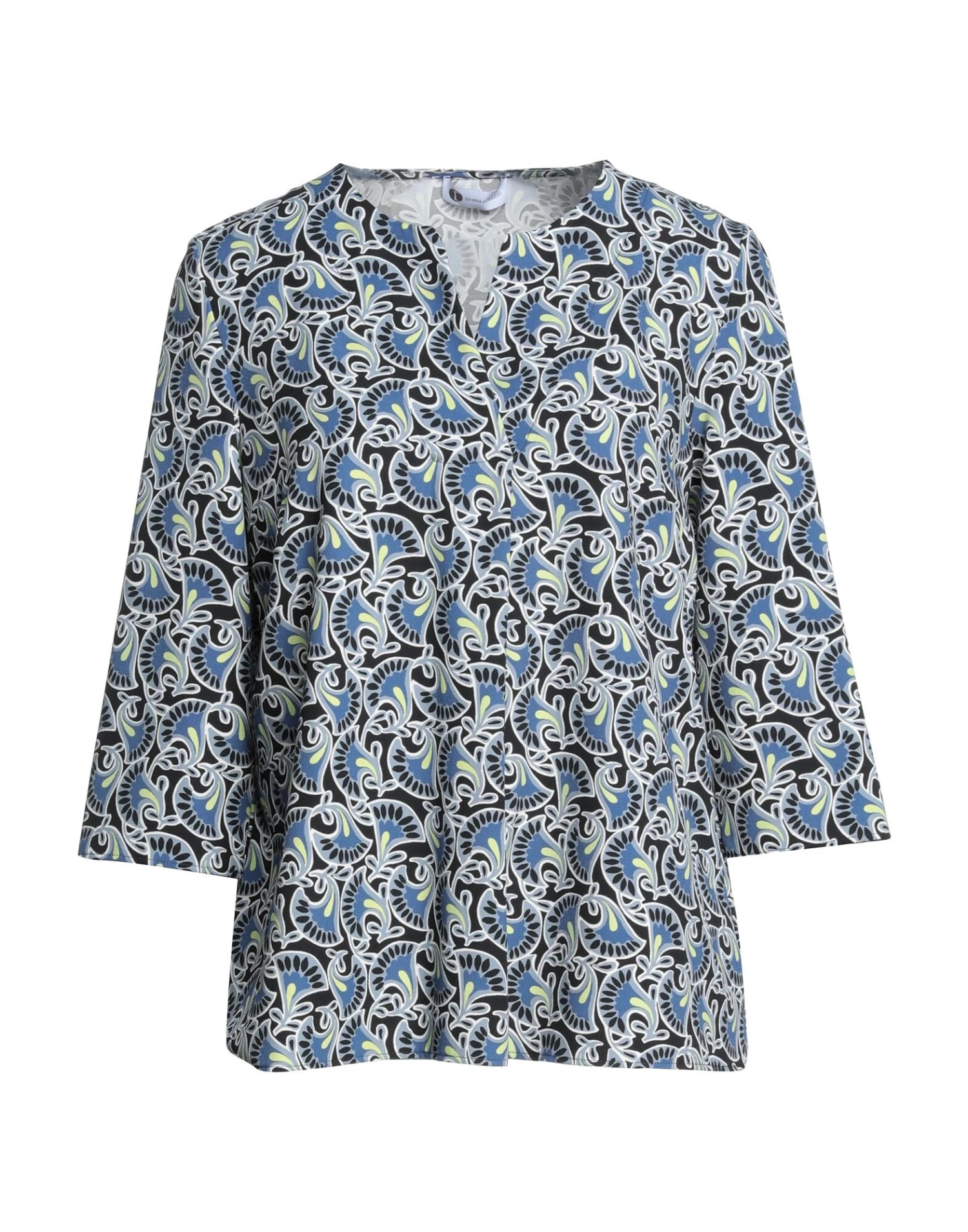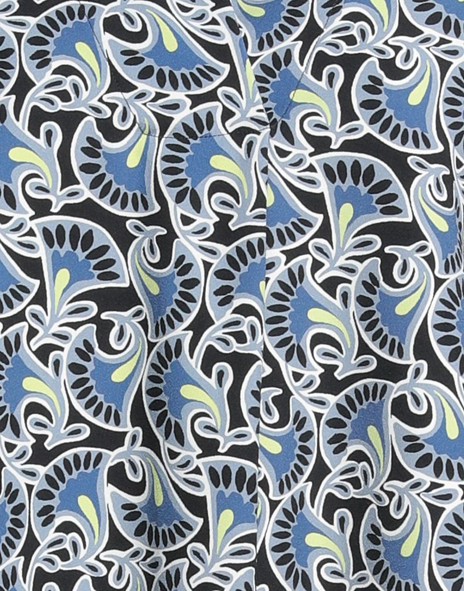 crepe, no appliqués, floral design, round collar, 3/4 length sleeves, no pockets, stretch