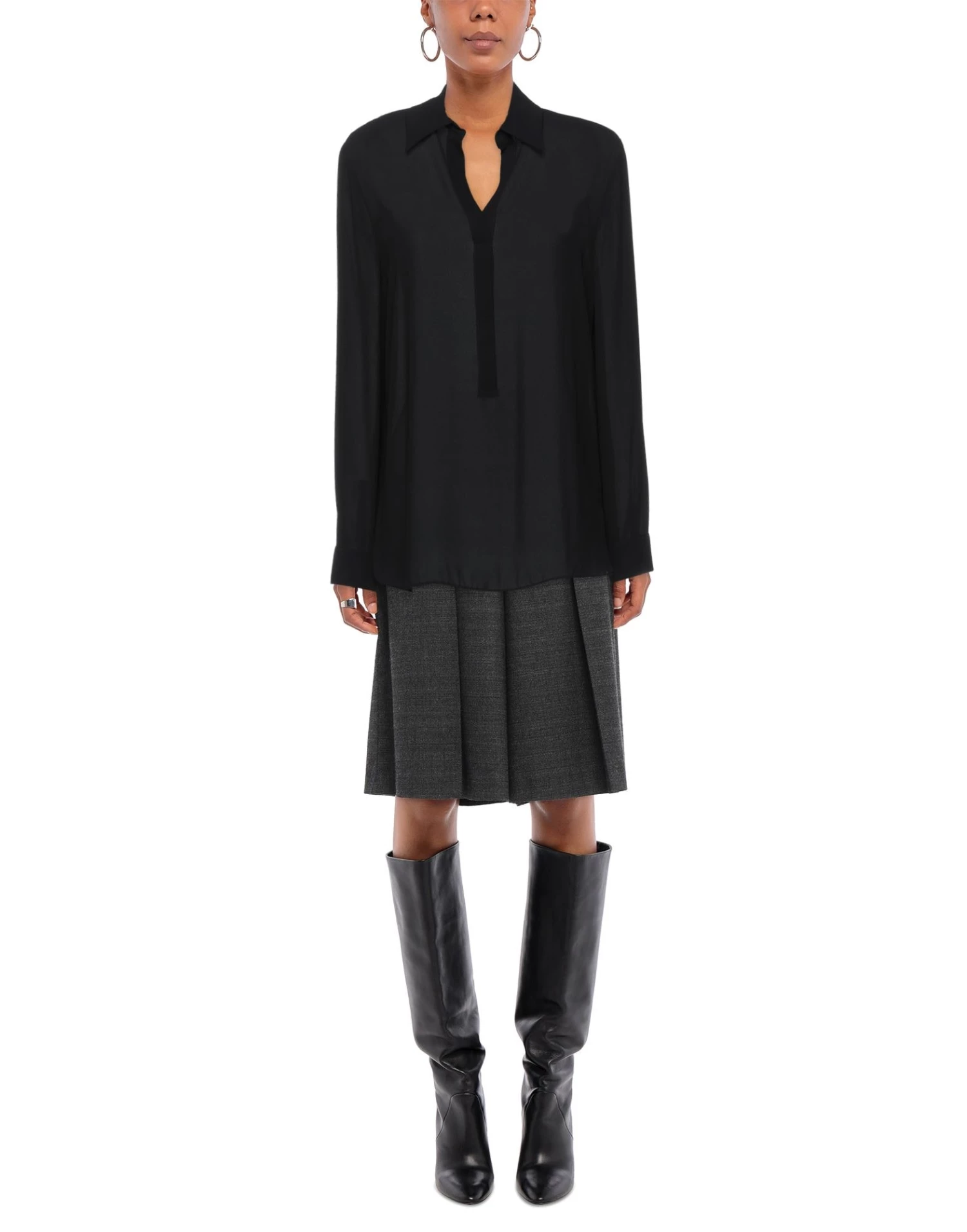 crepe, no appliqués, solid color, classic neckline, long sleeves, front closure, button closing, no pockets