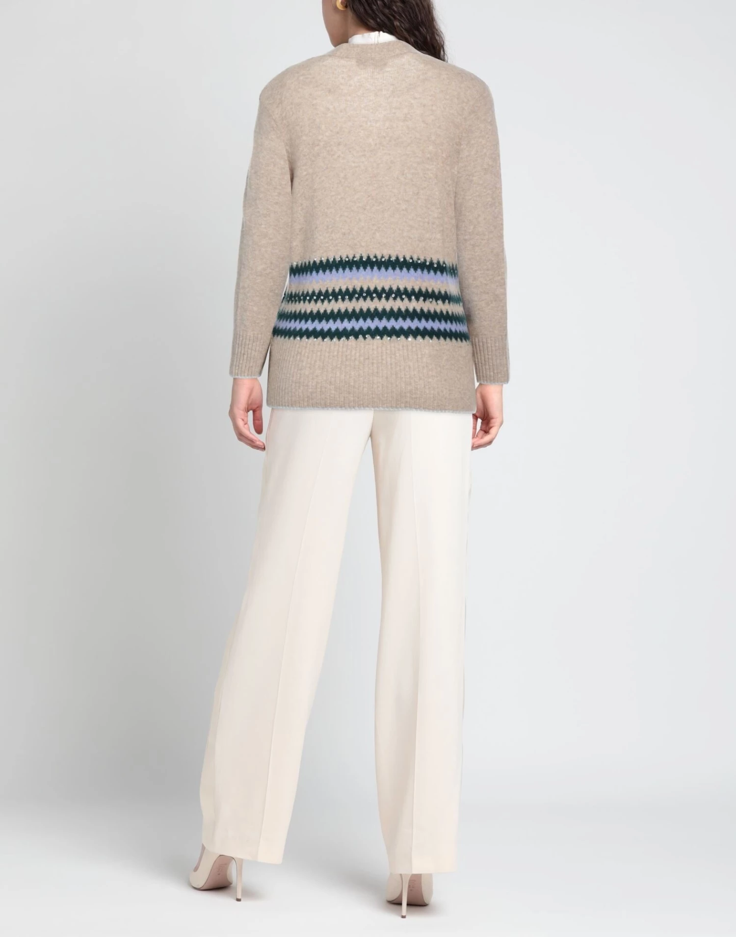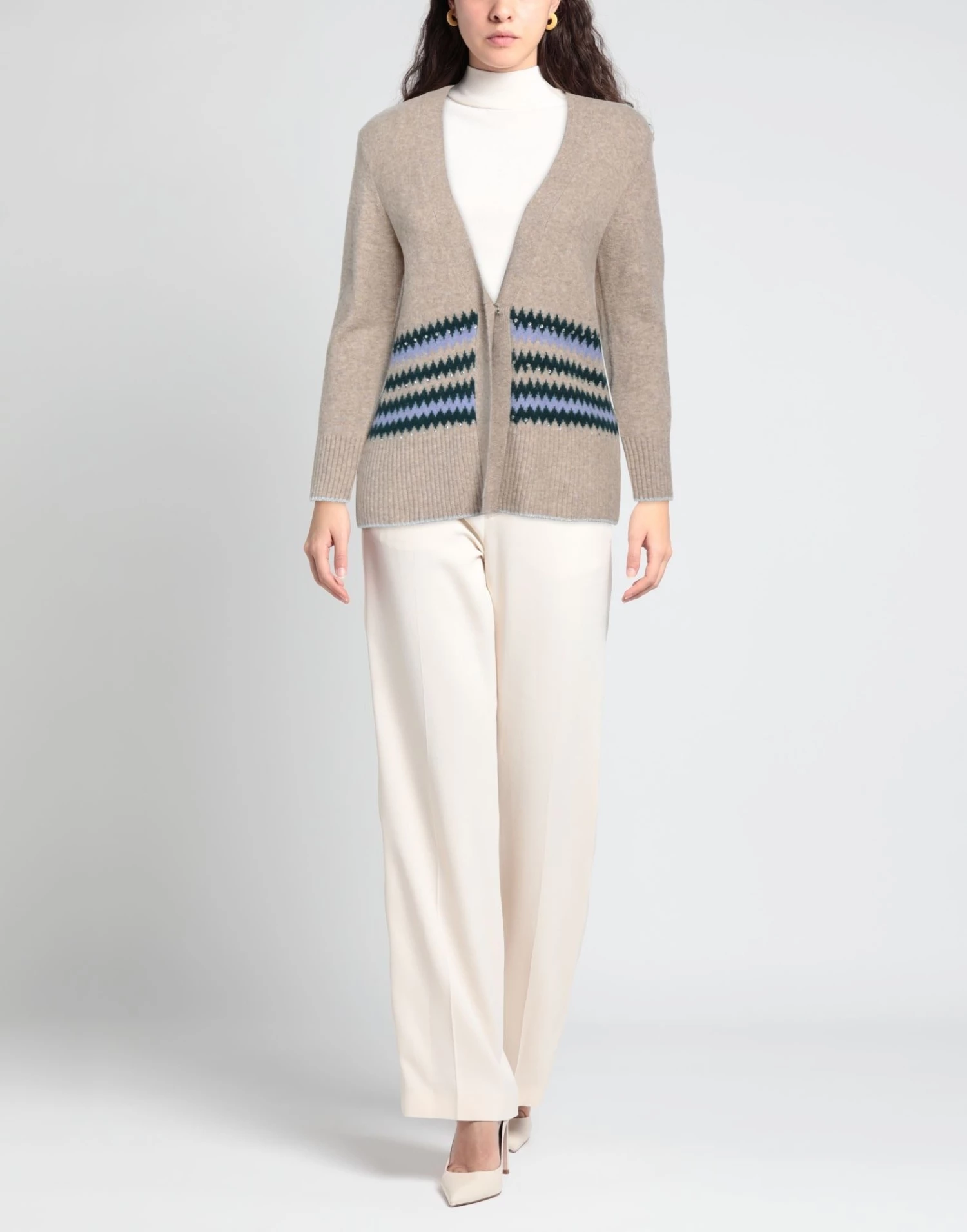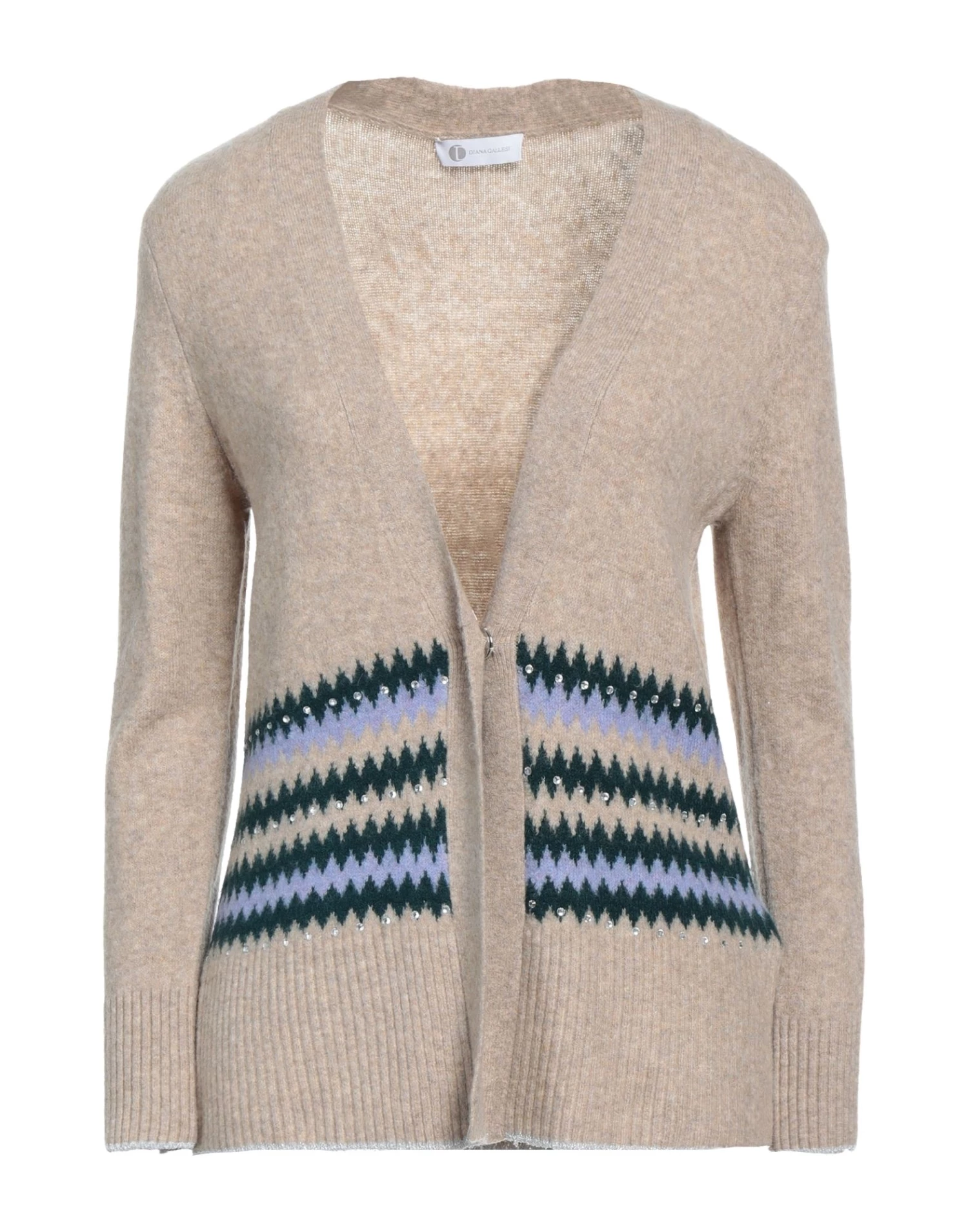knitted, mélange, lightweight knit, rhinestones, multicolor pattern, deep neckline, long sleeves, snap buttons fastening, no pockets, stretch