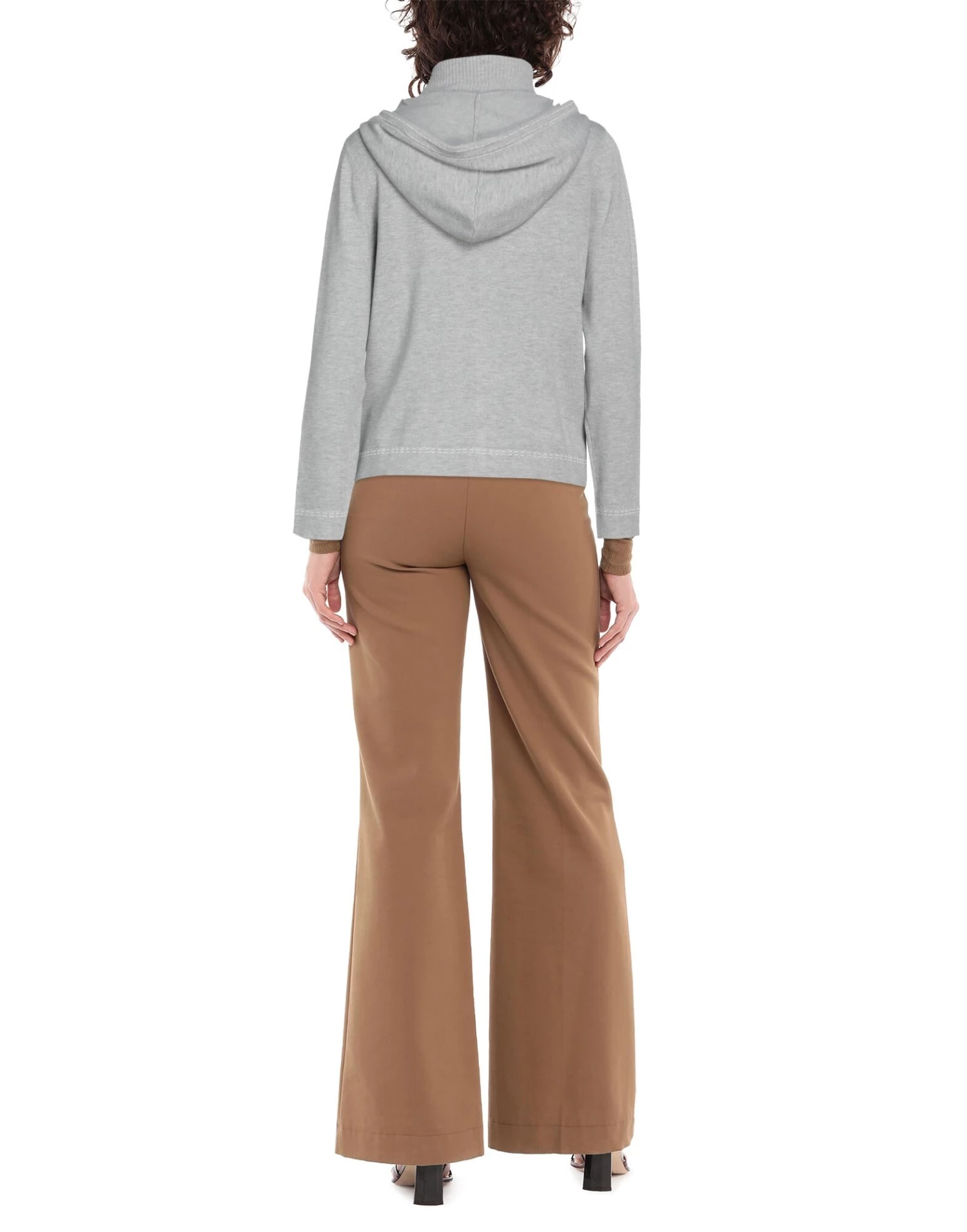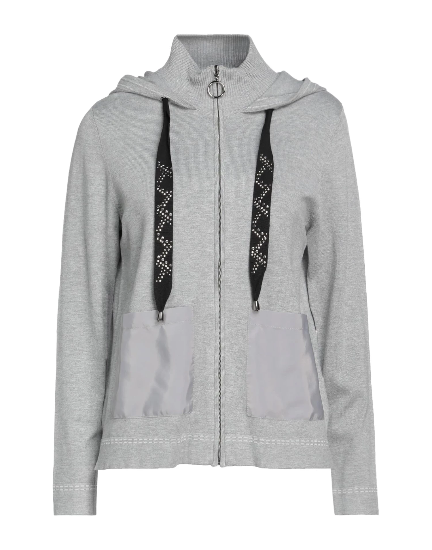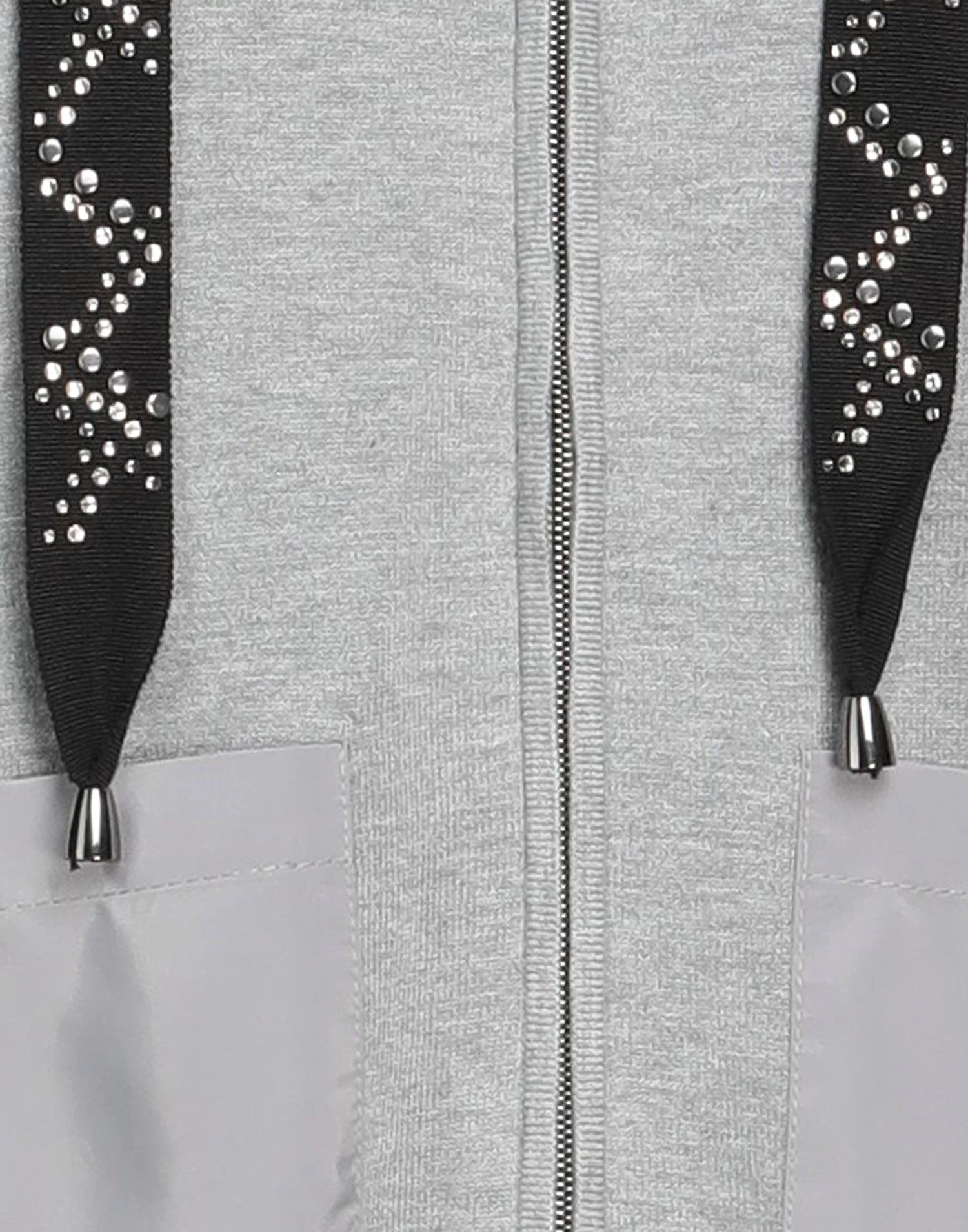 techno fabric, knitted, mélange, lightweight knit, rhinestones, laces, two-tone, hooded collar, long sleeves, zipper closure, multipockets