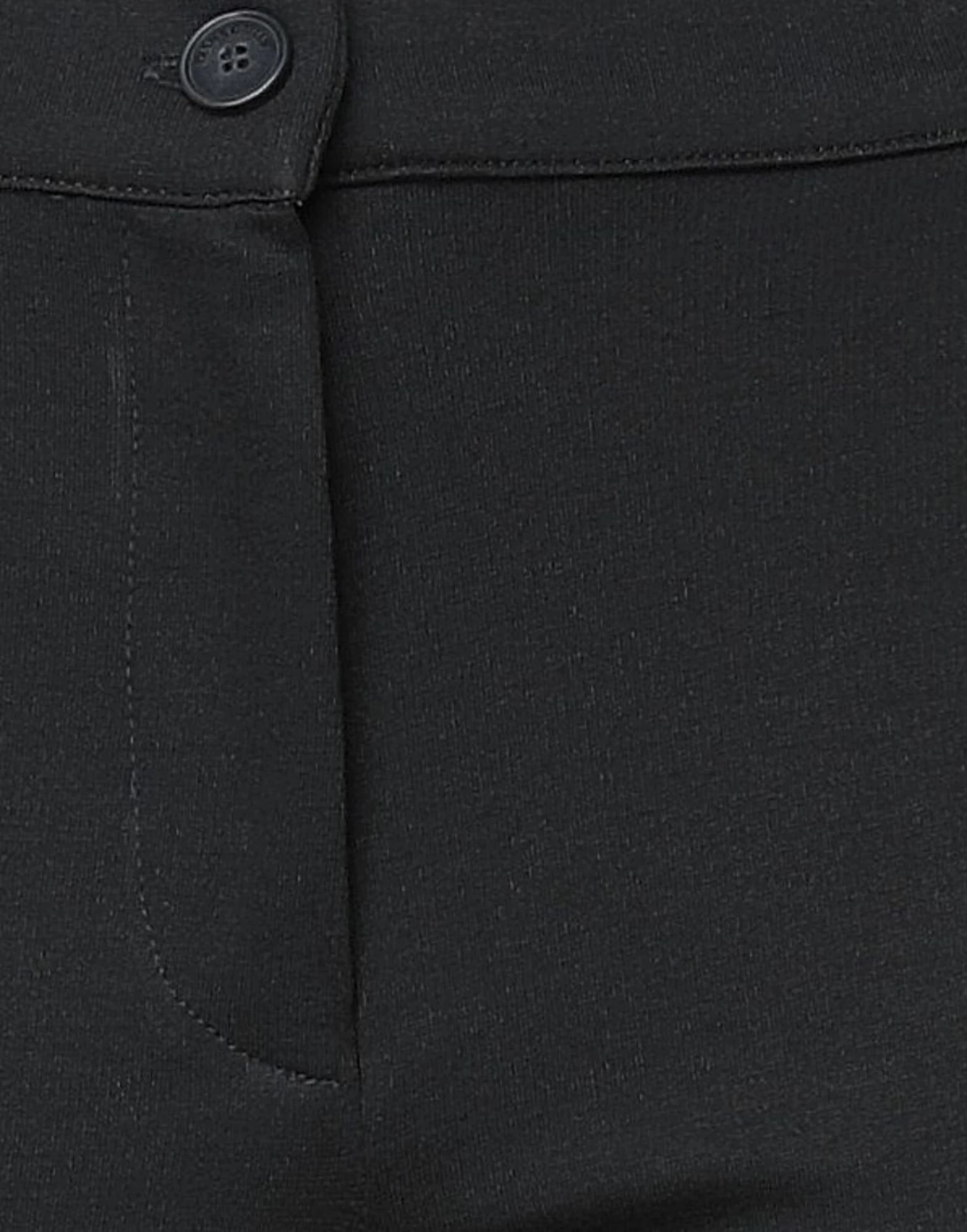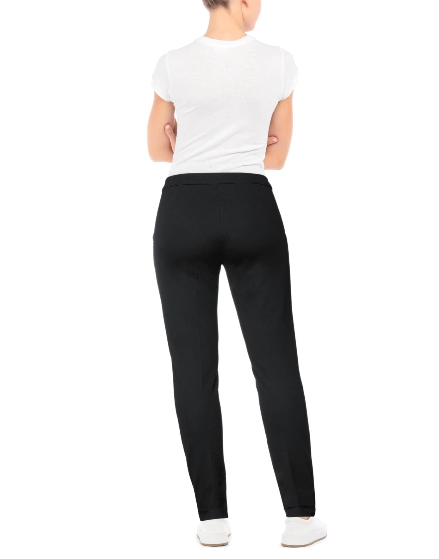 jersey, no appliqués, slim-leg pants, tapered leg, button closing, zipper closure, multipockets, cuffed hems, solid color, mid rise, stretch