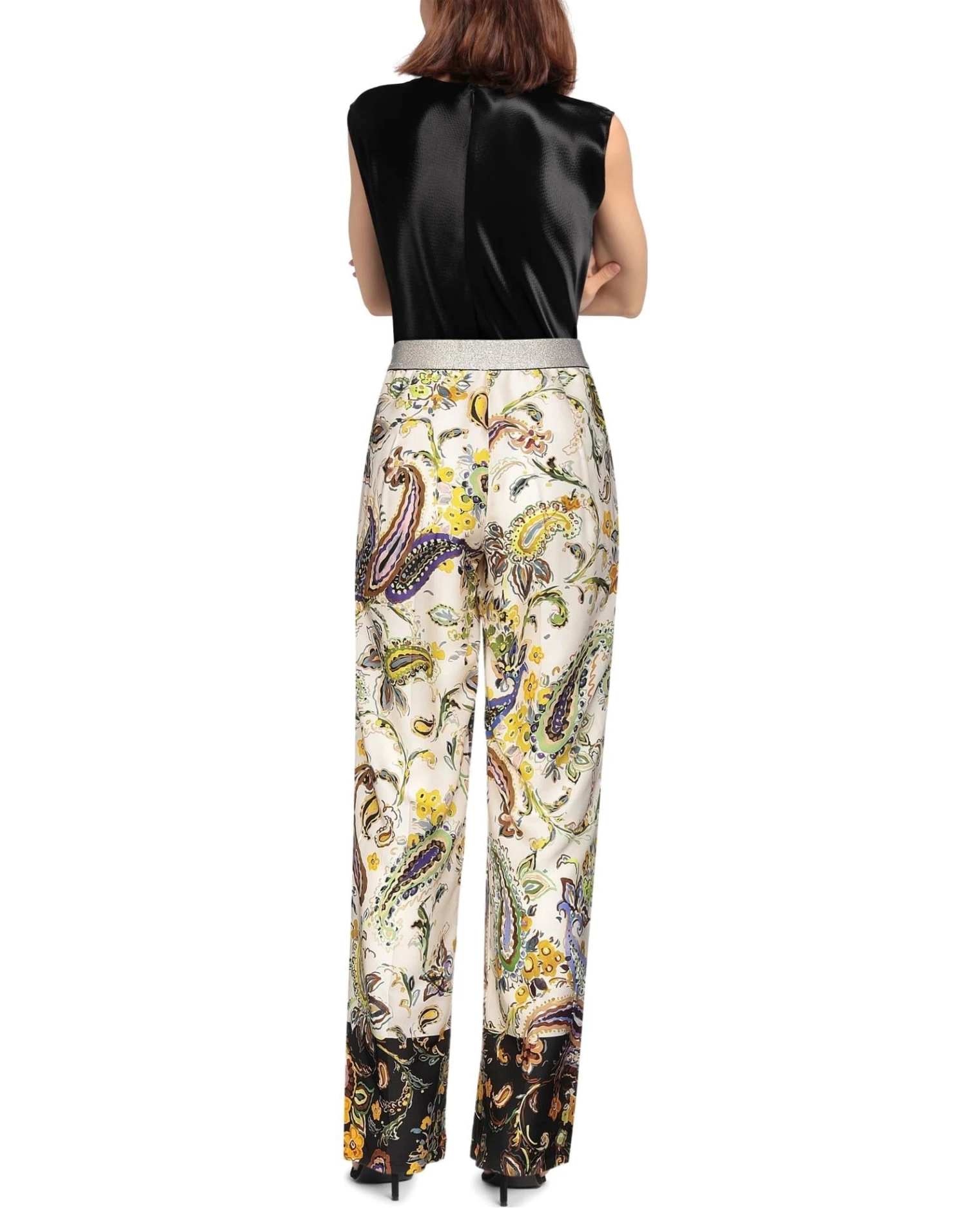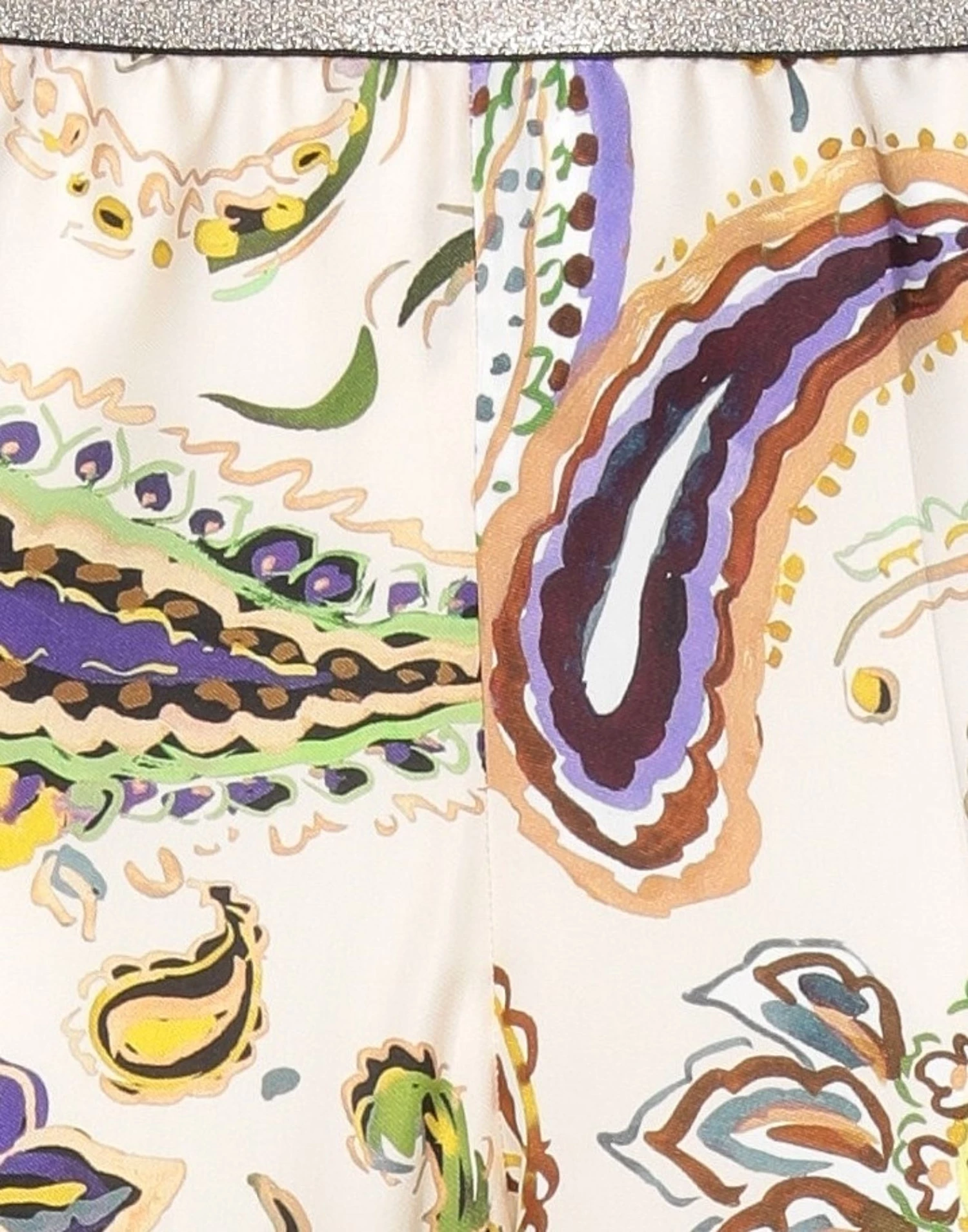 twill, no appliqués, paisley-print, high waisted, lamé, elasticized waist, straight leg, regular fit, zipper closure, no pockets