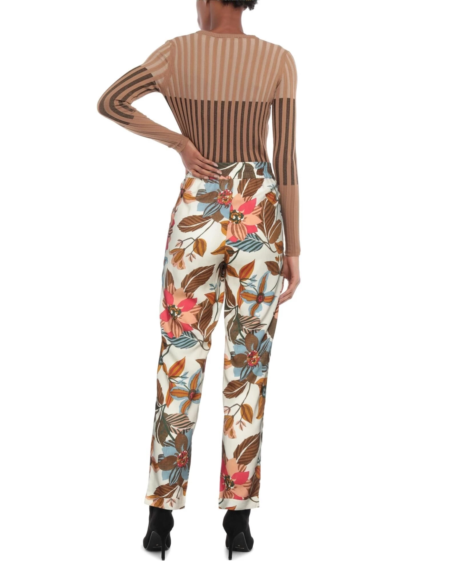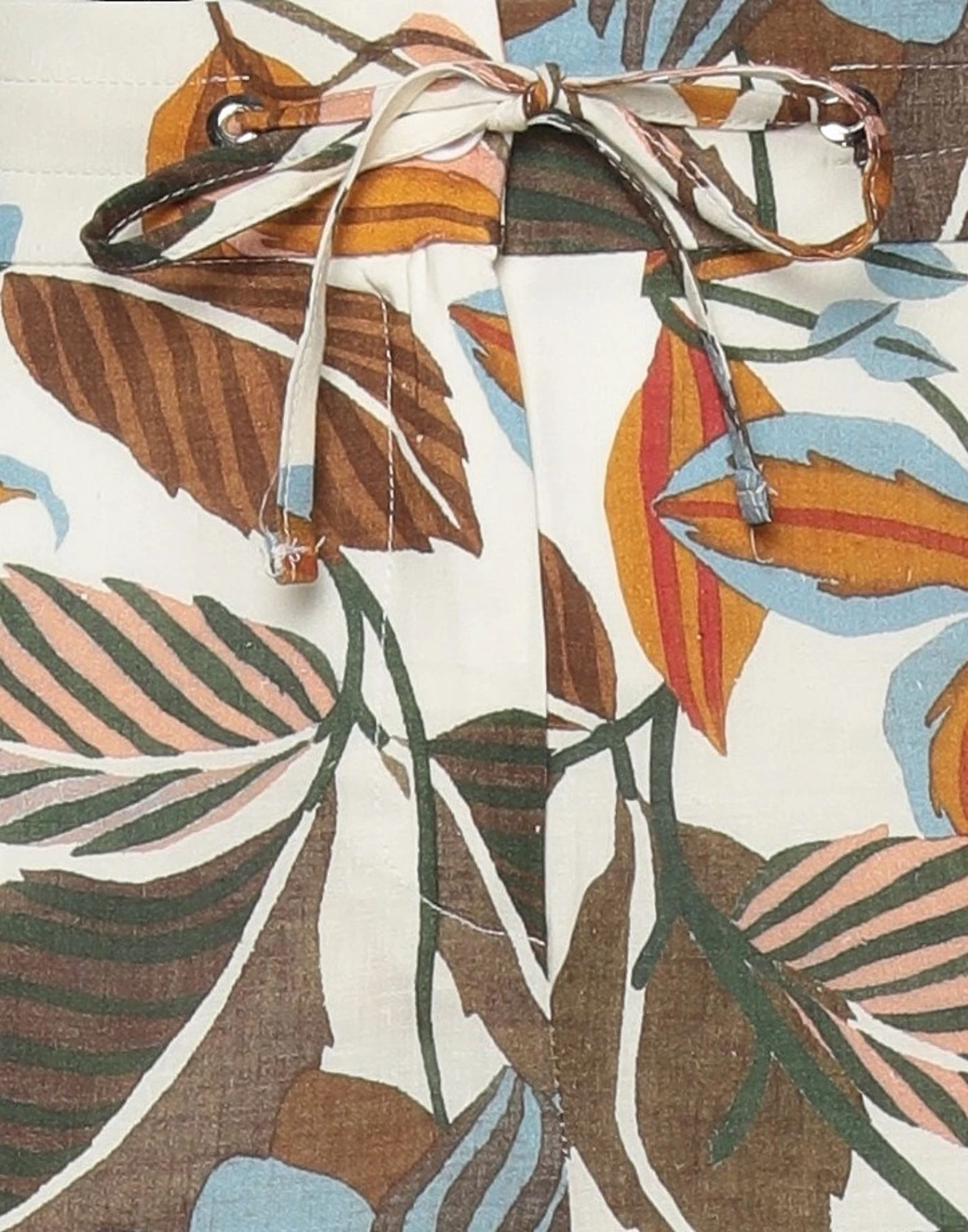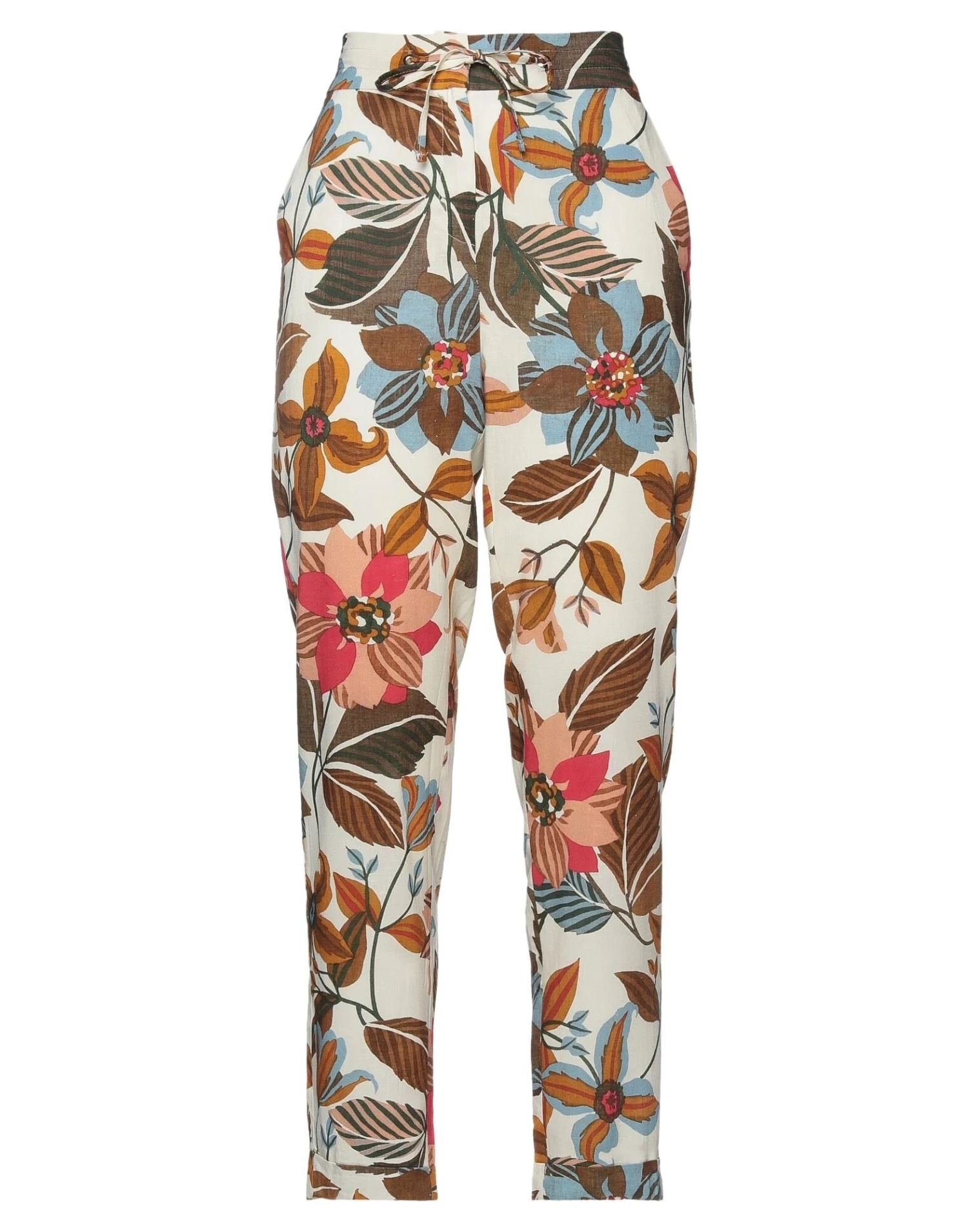 plain weave, no appliqués, floral design, high waisted, tapered leg, regular fit, 1 button, zipper closure, drawstring waist, multipockets