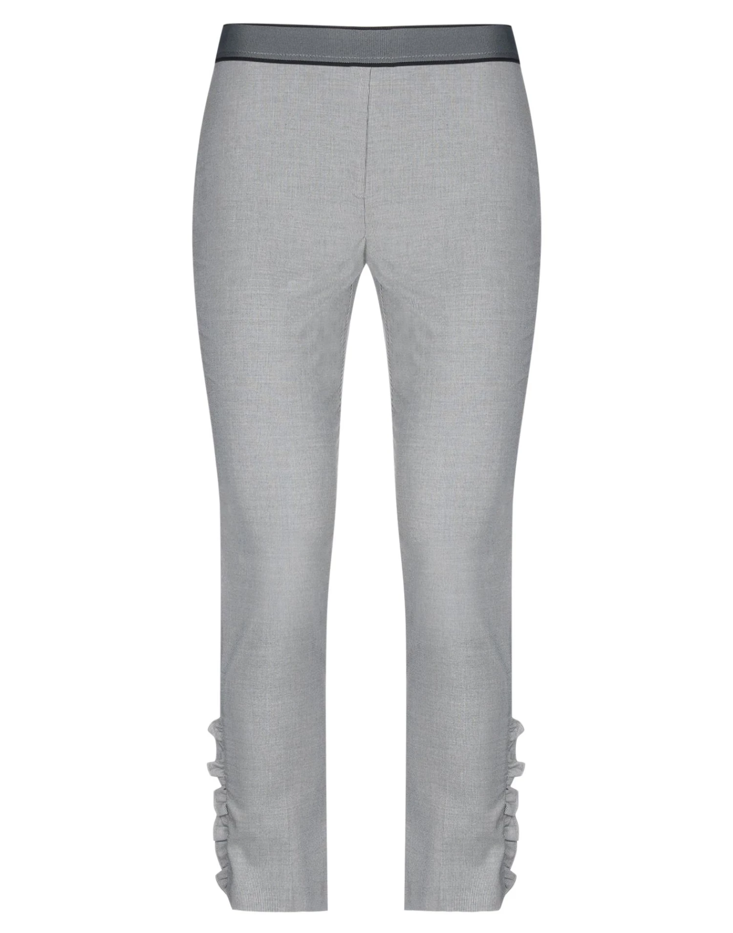 plain weave, multicolor pattern, ruffles, mid rise, regular fit, tapered leg, zipper closure, no pockets, stretch