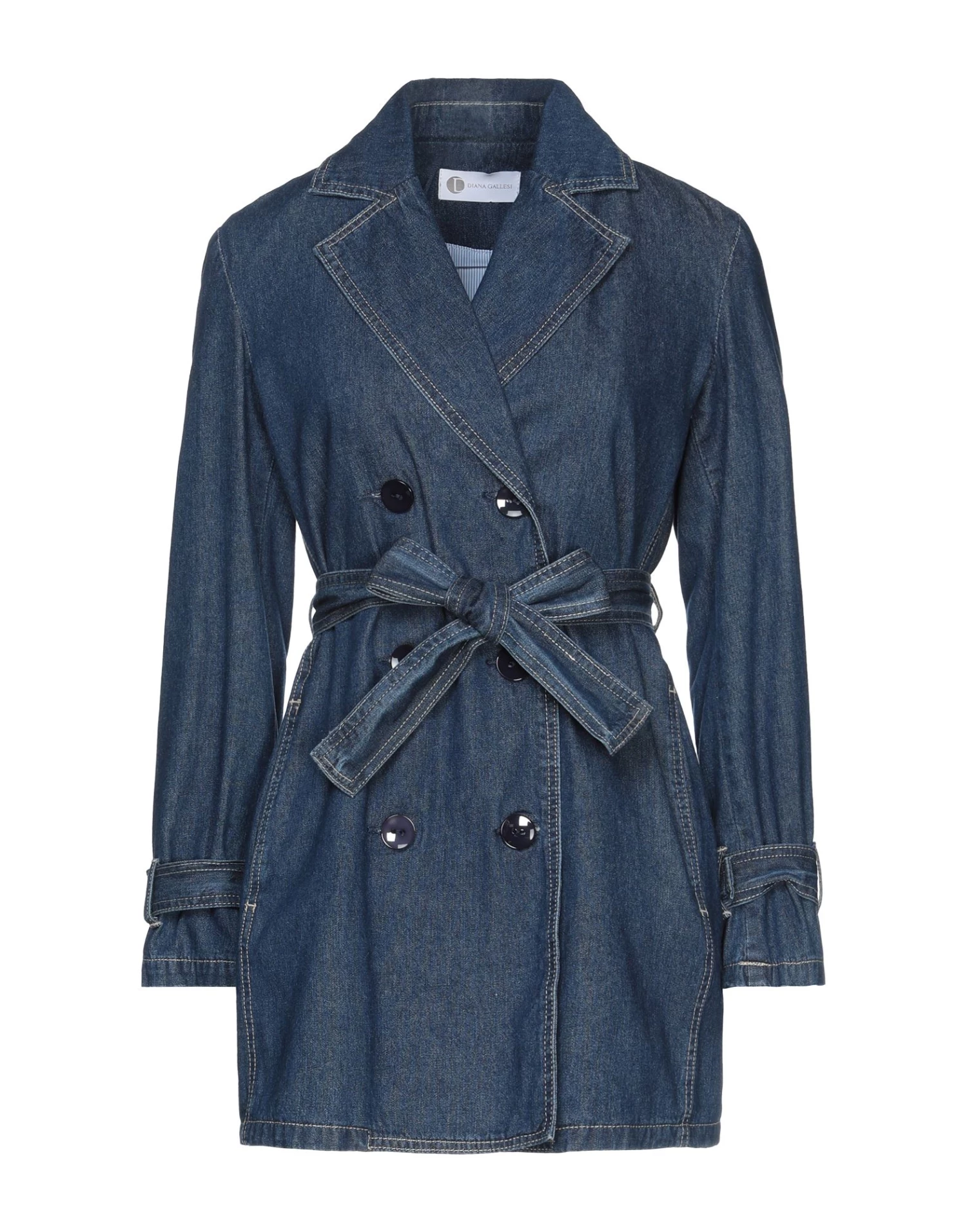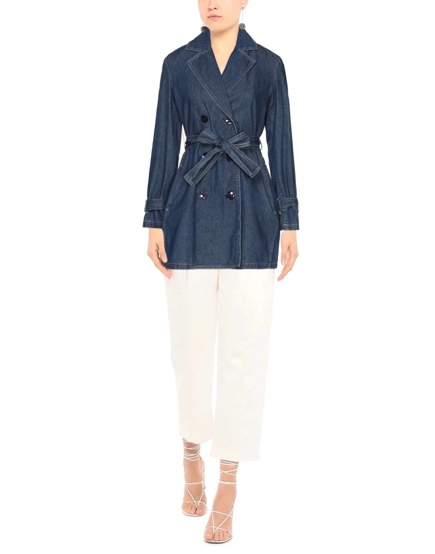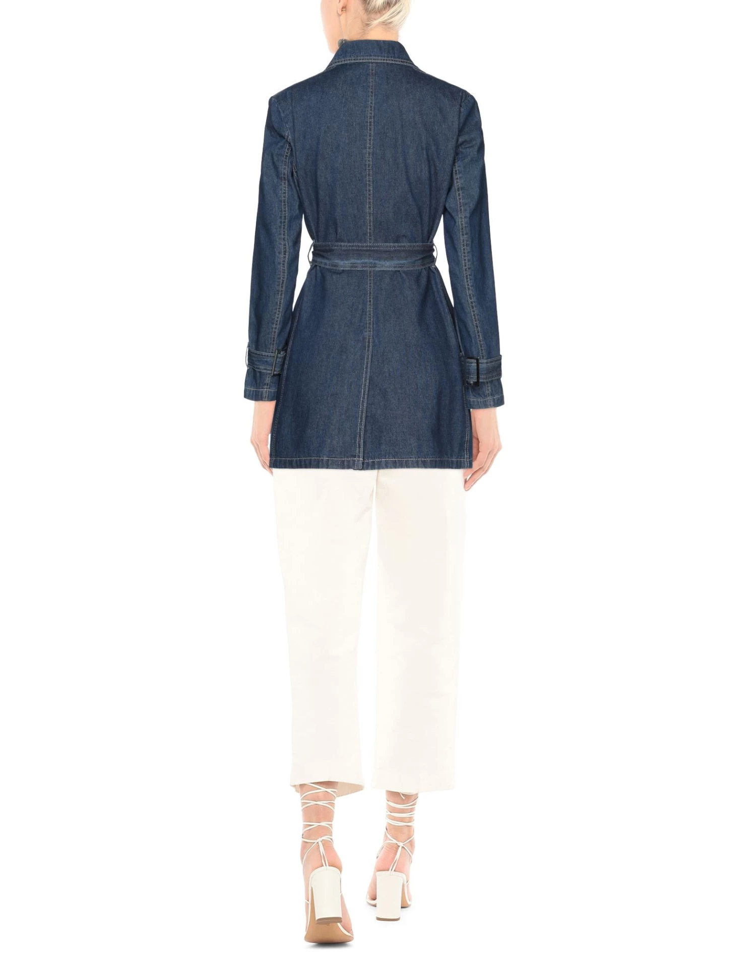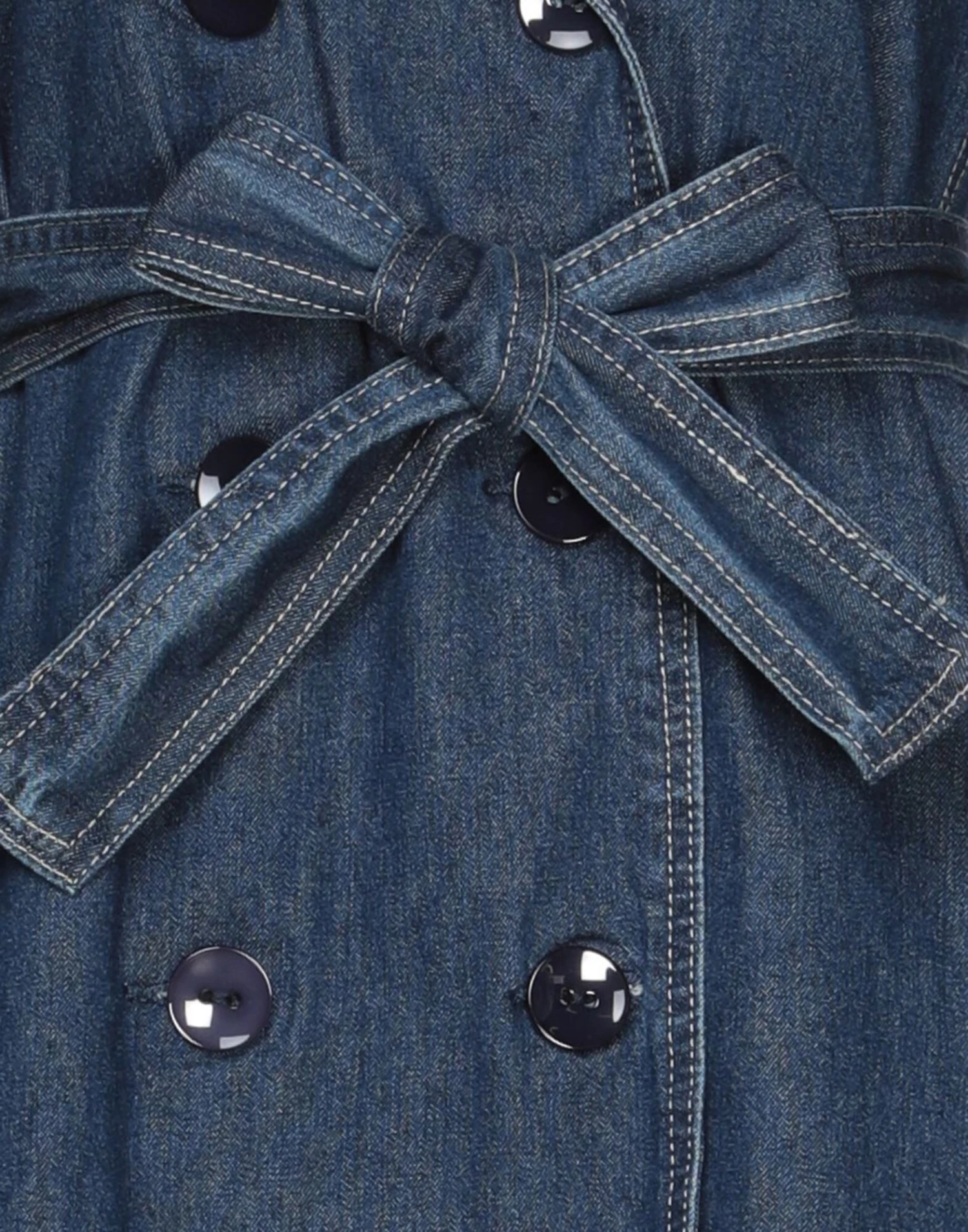 denim, belt, solid color, lapel collar, double-breasted, long sleeves, partially lined interior, button closing, multipockets, dark wash