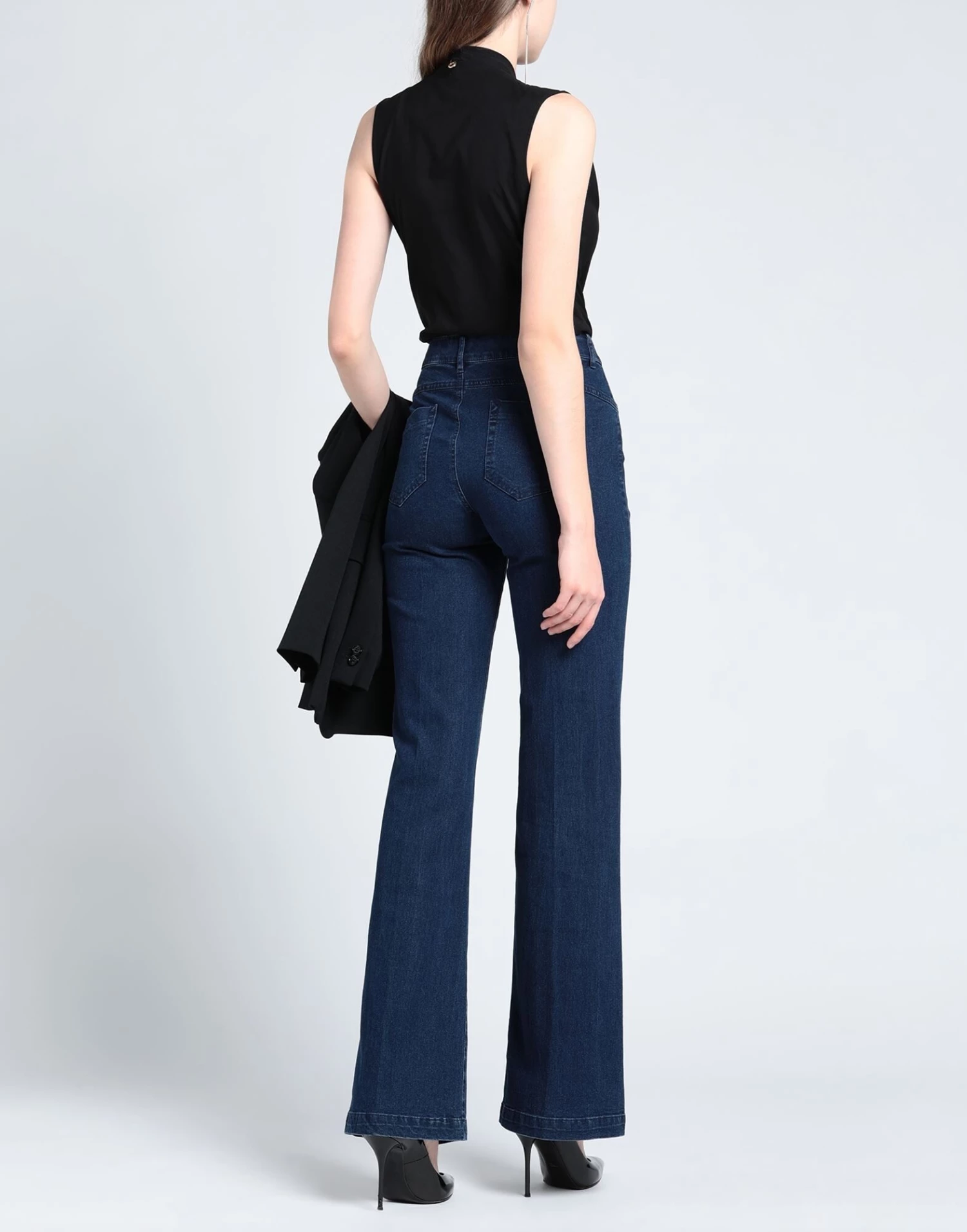 denim, no appliqués, solid color, dark wash, mid rise, belt loops, flared cut, regular fit, zipper closure, 1 button, five pockets, stretch