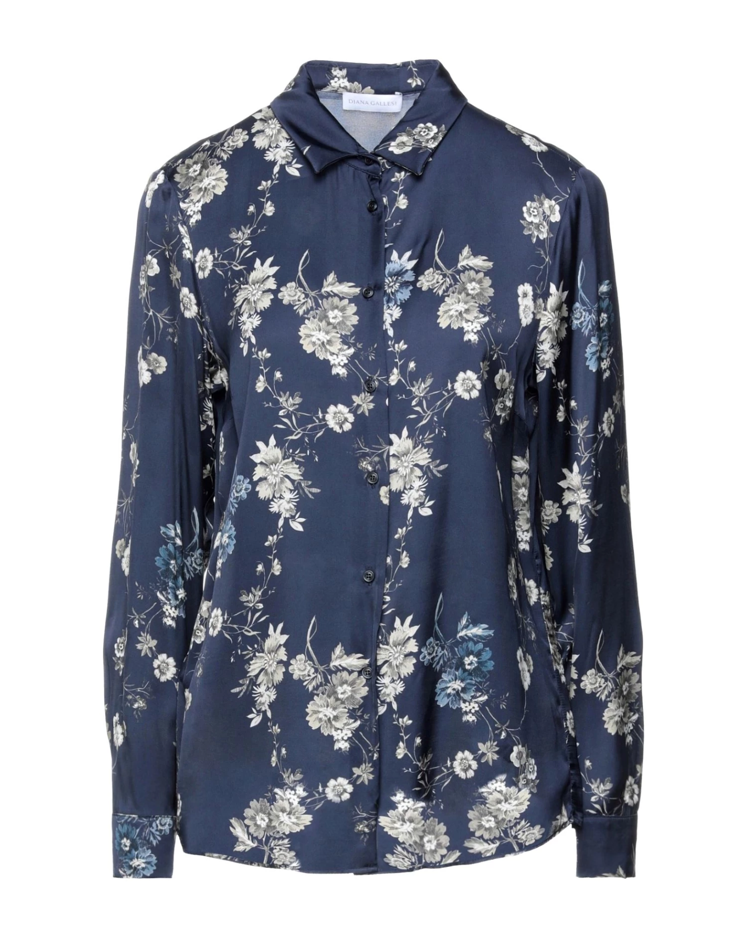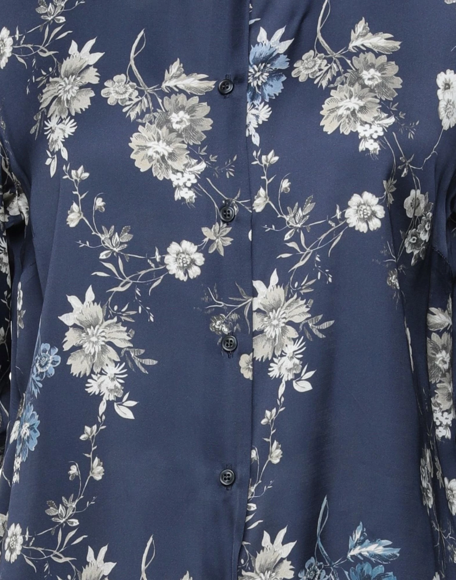 satin, no appliqués, floral design, classic neckline, long sleeves, buttoned cuffs, button closing, no pockets