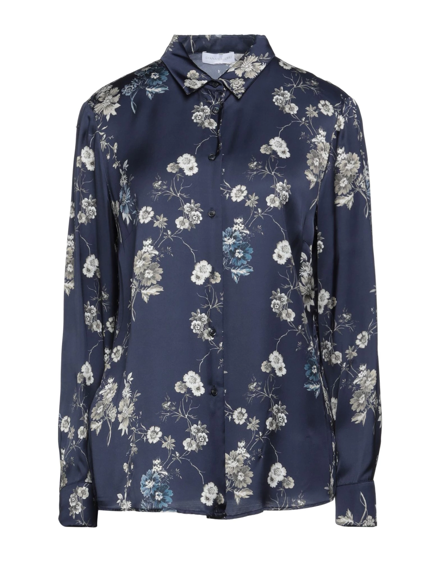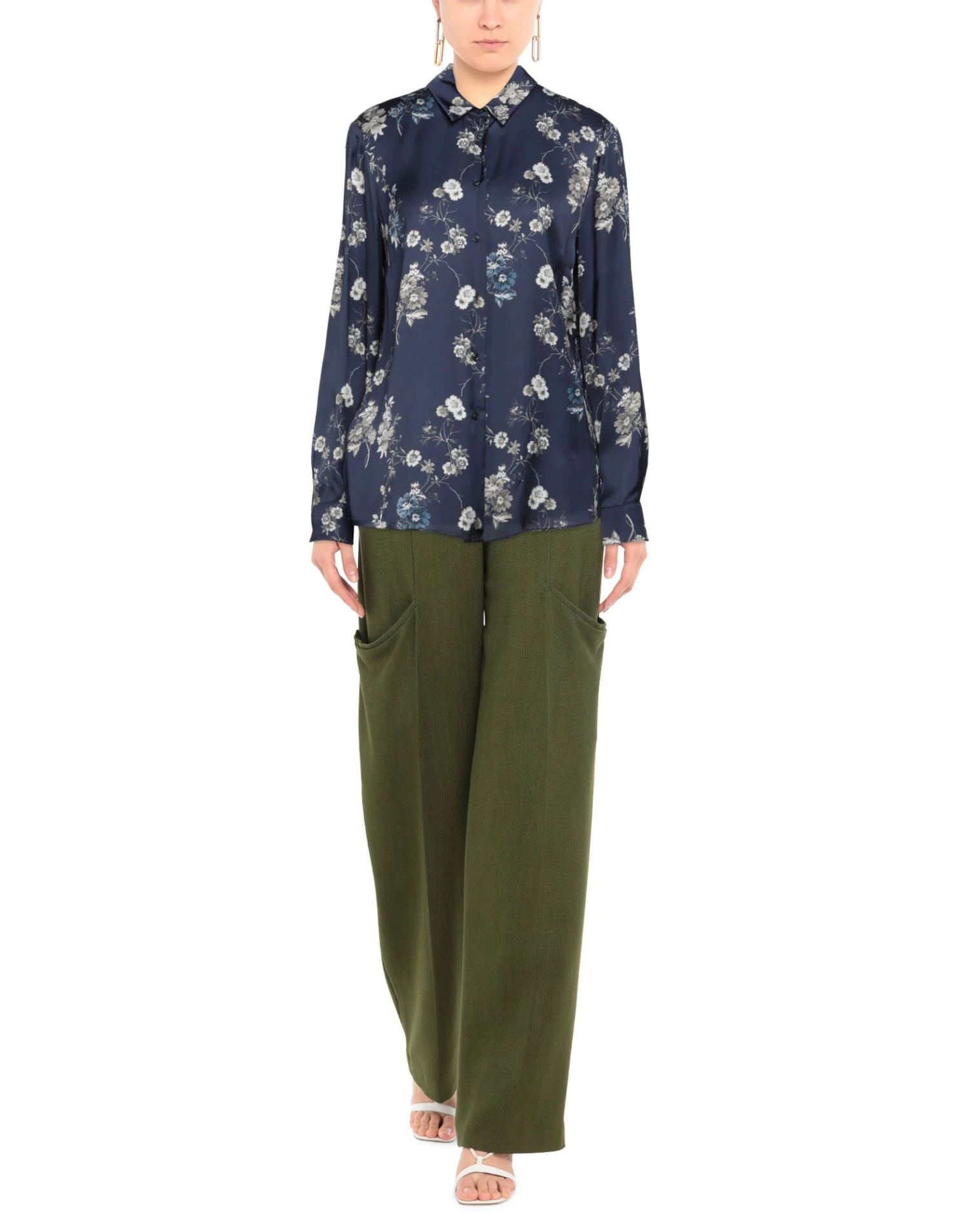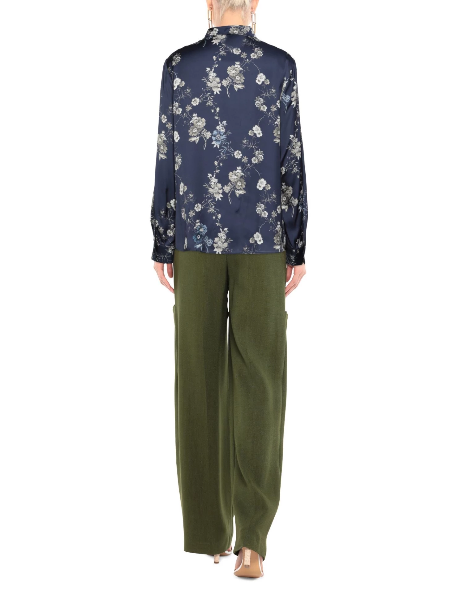 satin, no appliqués, multicolor pattern, floral design, classic neckline, long sleeves, buttoned cuffs, button closing, no pockets