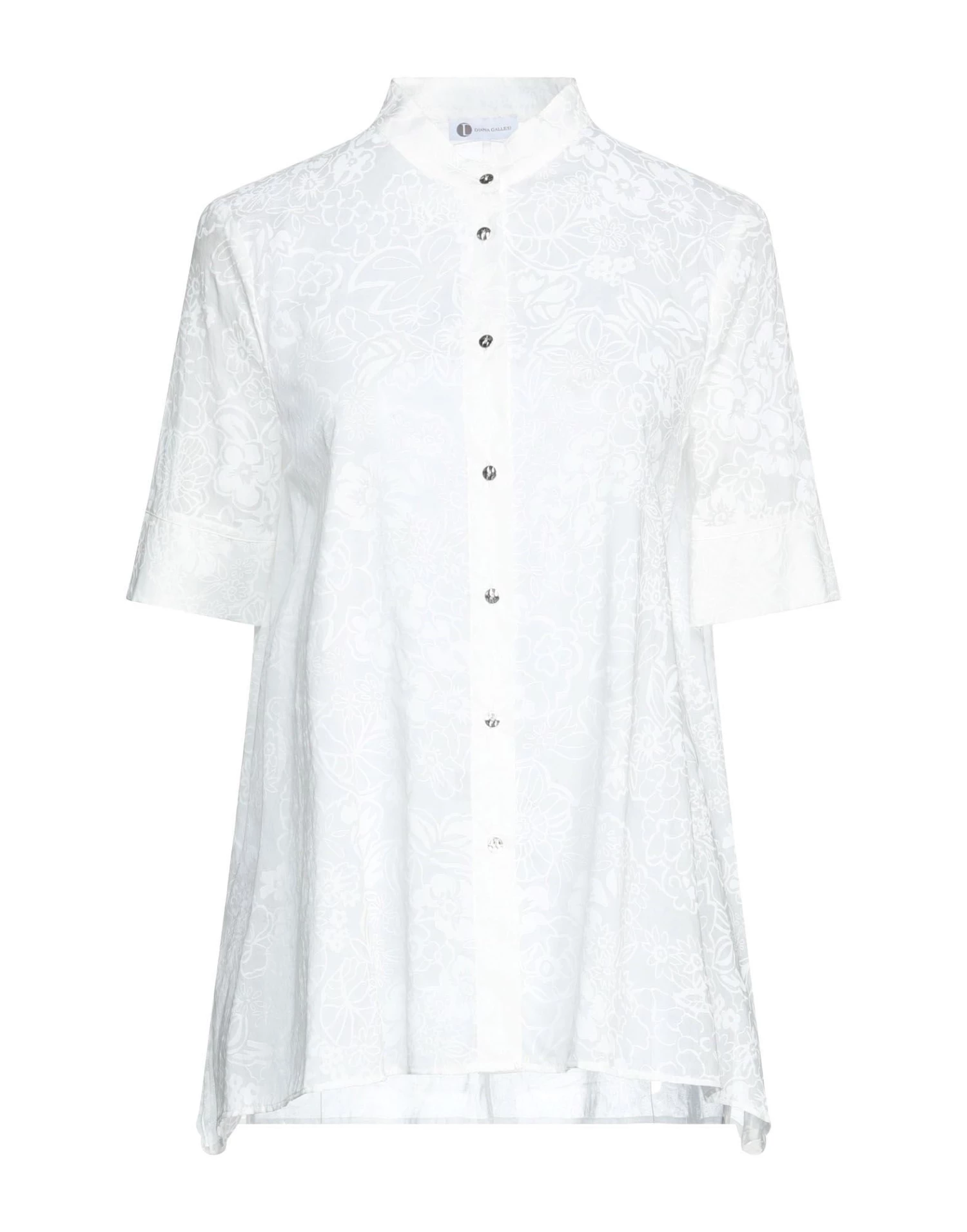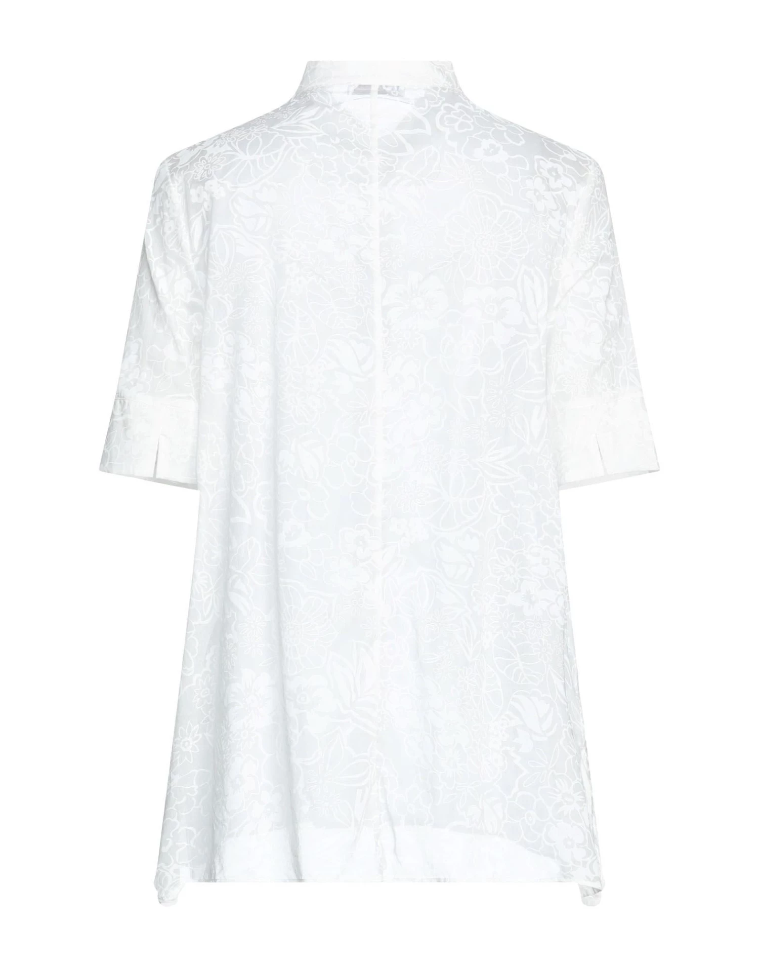 plain weave, floral design, mandarin collar, short sleeves, no pockets, no appliqués