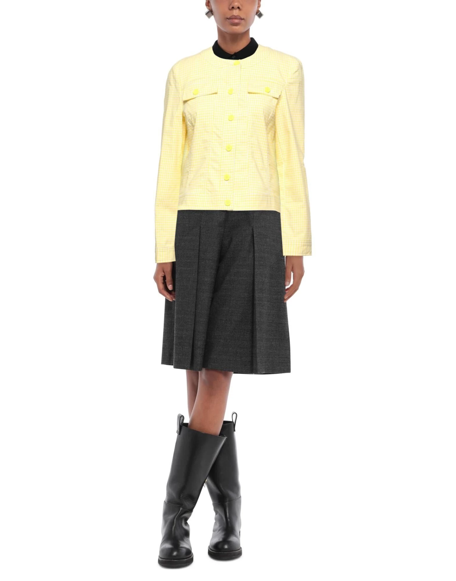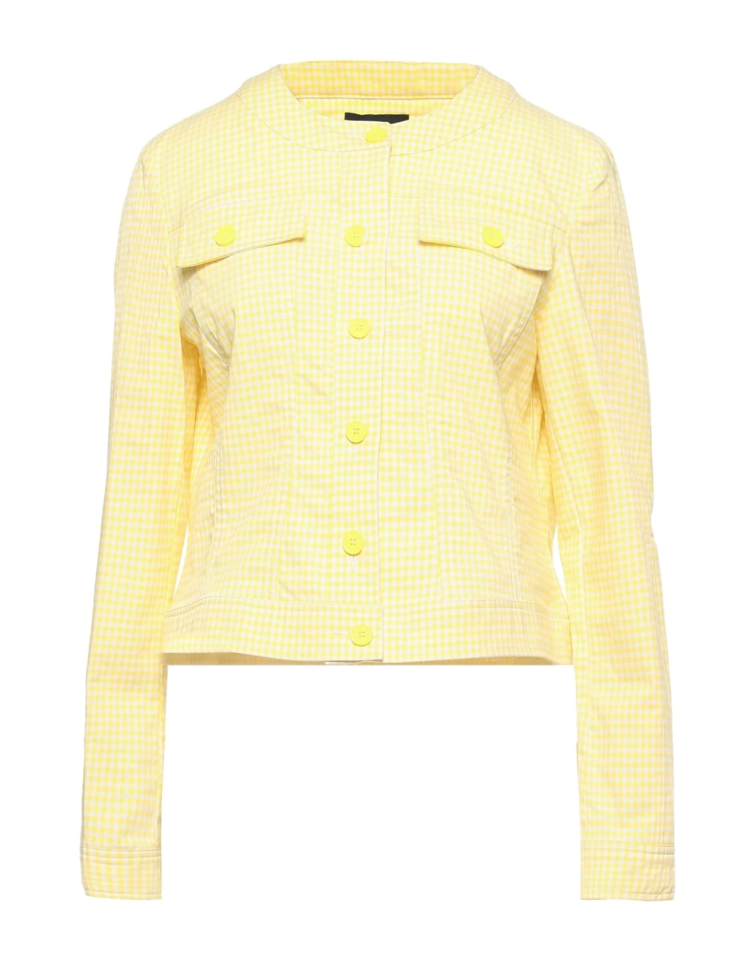 plain weave, no appliqués, checked, mandarin collar, single-breasted , long sleeves, unlined, two breast pockets, stretch