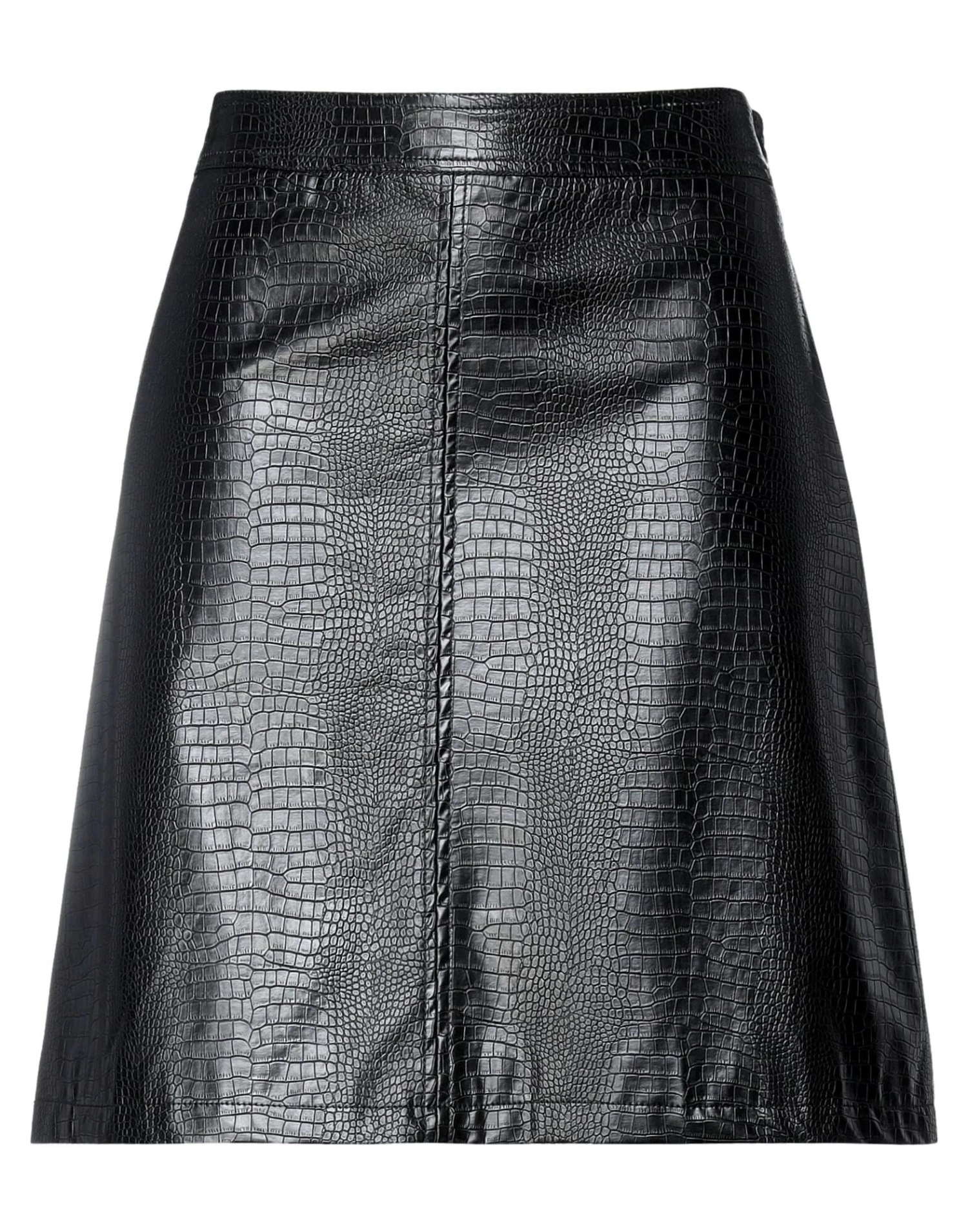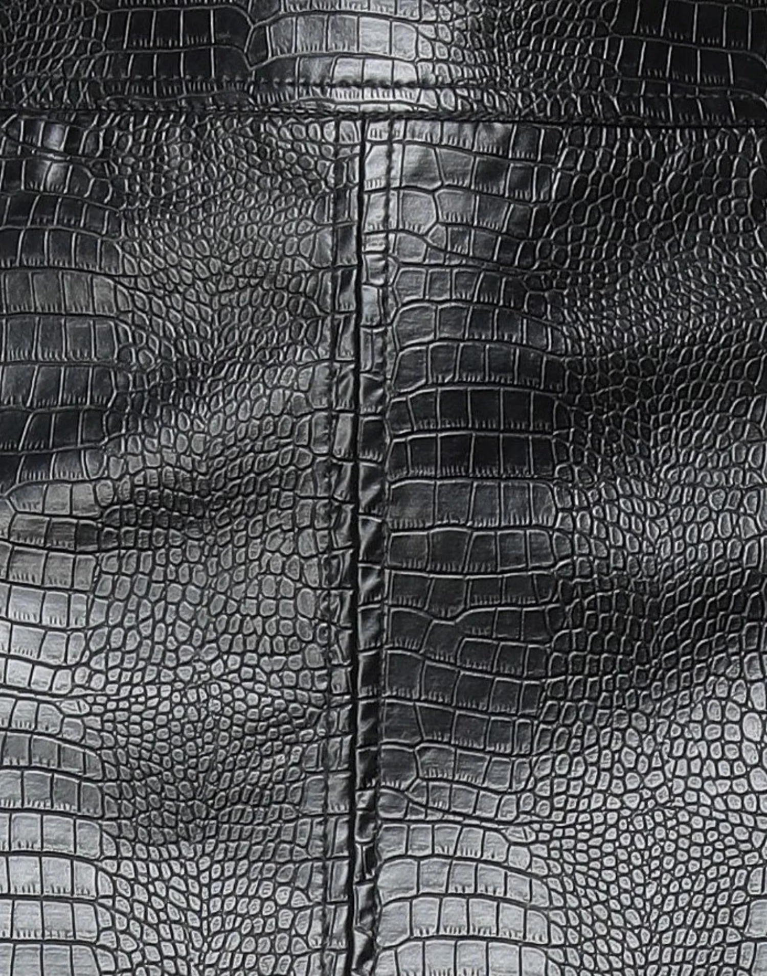 coated fabric, snakeskin print, no appliqués, solid color, zipper closure, no pockets, fully lined