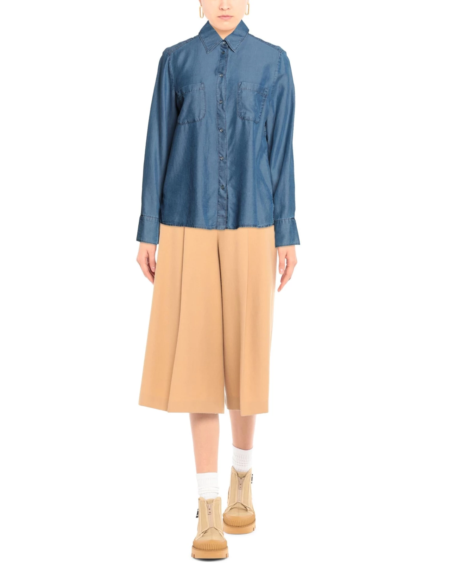 plain weave, denim effect, no appliqués, solid color, classic neckline, long sleeves, snap button cuffs, snap buttons fastening, two breast pockets