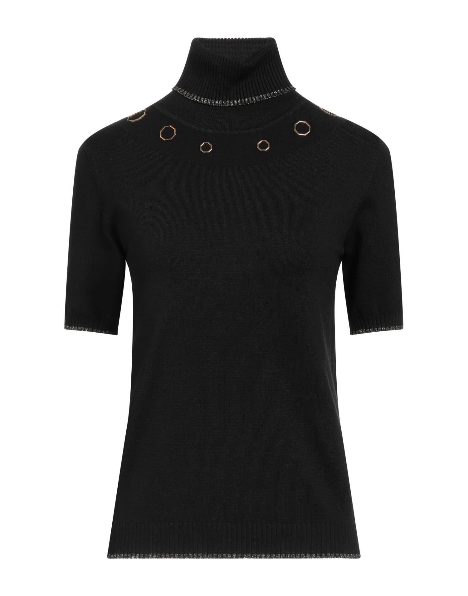 knitted, lamé, metal applications, solid colour with appliqués, turtleneck, short sleeves, no pockets, lightweight knit